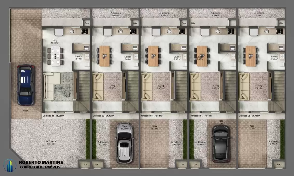 · Diferencial do Sobrado 01: pátio/garagem exclusivo com aproximadamente 70 m² de área.